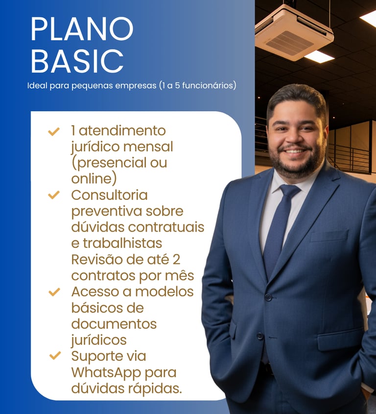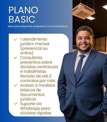 Ideal para negócios com 1 a 5 funcionários, o Plano Basic oferece o suporte jurídico necessário para manter sua empresa protegida no dia a dia.