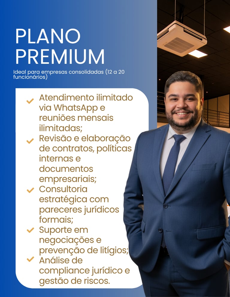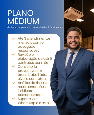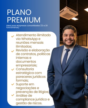 Desenvolvido para empresas de 12 a 20 funcionários, o Plano Premium garante atendimento prioritário, revisões contratuais periódicas e consultoria estratégica em todas as áreas jurídicas do negócio.